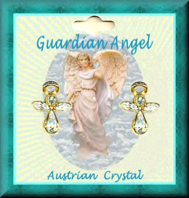 4 Austrian clear Crystal stones make up these Guardian Angel pierced earrings in gold plate. Shipped 12 pair earrings on Guardian Angel rack cards in 1 dozen packs. See #10759 for Birthstone earring version. ($3.00 each) MADE IN USA